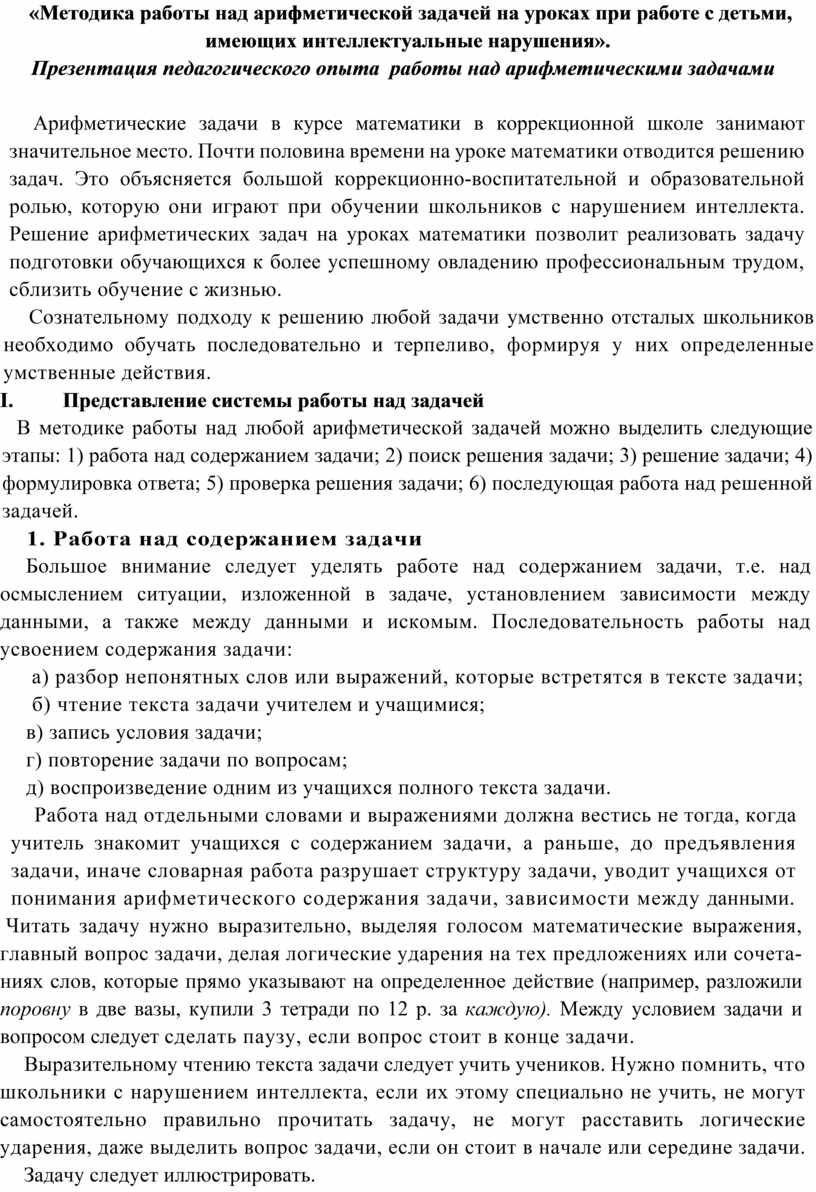 «Методика работы над арифметической задачей на уроках при работе с детьми, имеющих интеллектуальные нарушения».
