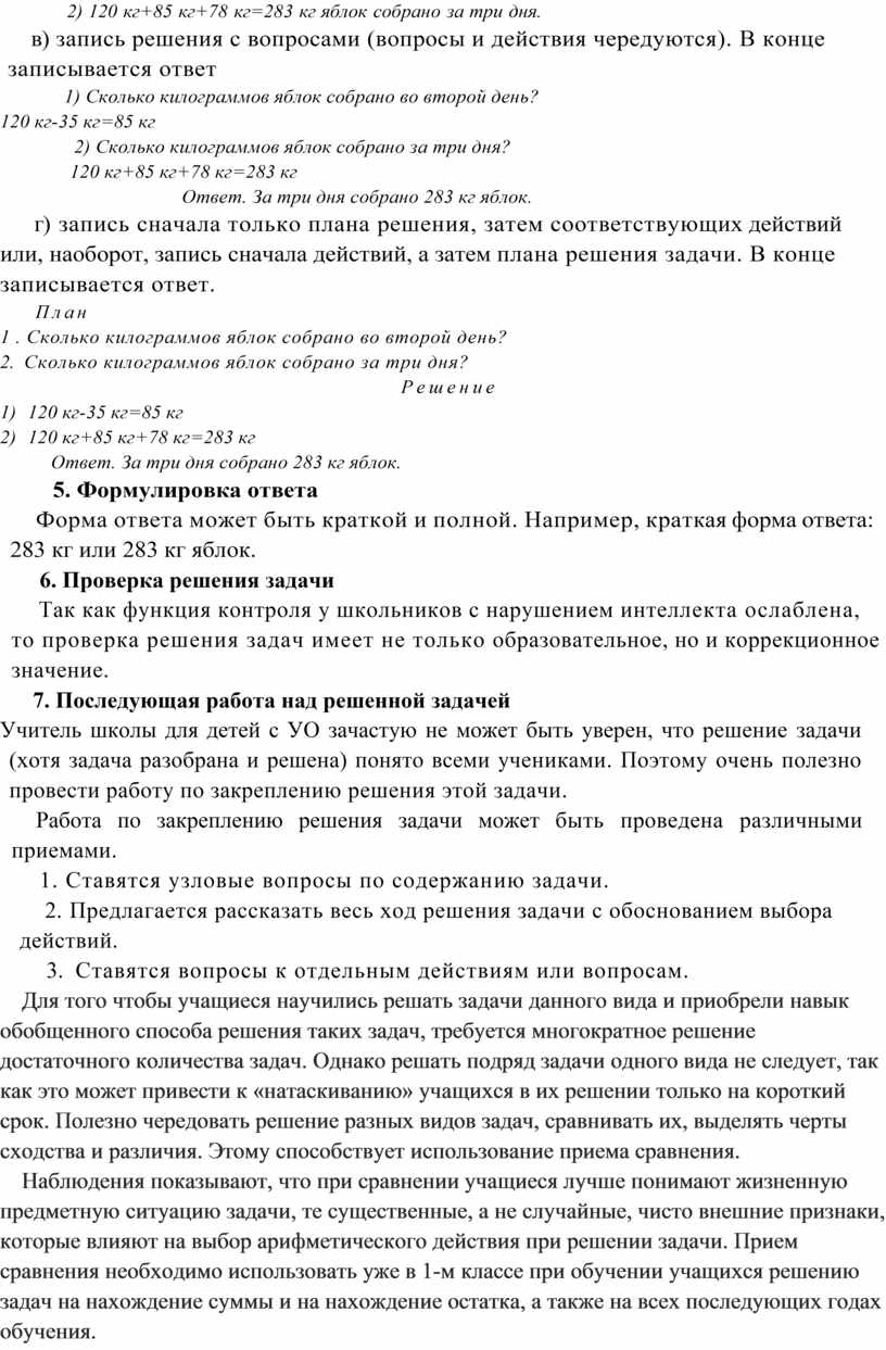 Так как функция контроля у школьников с нарушением интеллекта ослаблена, то проверка решения задач имеет не только образовательное, но и коррекционное значение.