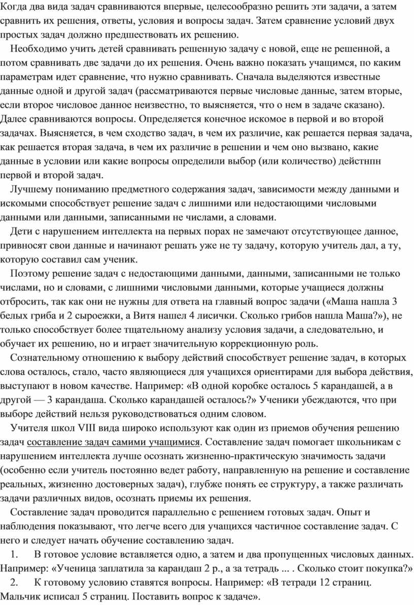 Учителя школ VIII вида широко используют как один из приемов обучения решению задач составление задач самими учащимися. Составление задач помогает школьникам с нарушением интеллекта лучше осознать жизненно-практическую значимость задачи (особенно если учитель постоянно ведет работу, направленную на решение и составление реальных, жизненно достоверных задач), глубже понять ее структуру, а также различать задачи различных видов, осознать приемы их решения.