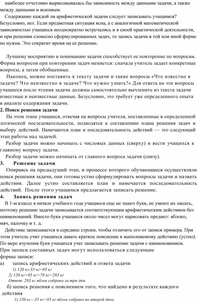 Содержание каждой ли арифметической задачи следует записывать учащимся? Безусловно, нет. Если предметная ситуация ясна, а с аналогичной математической зависимостью учащиеся неоднократно встречались и в своей практической деятельности, и при решении словесно сформулированных задач, то запись задачи в той или иной форме не нужна. Это сократит время на ее решение.