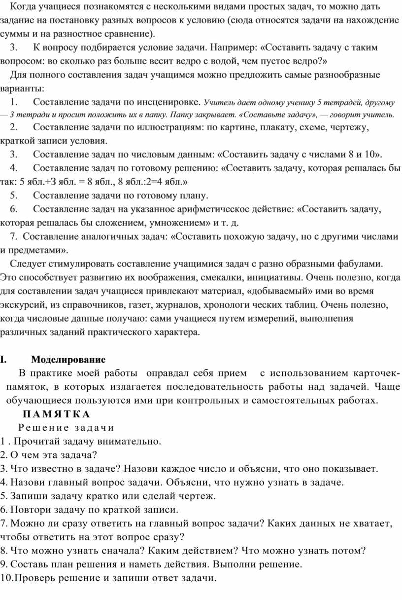 Работе по этим карточкам-памяткам детей следует учить. Сначала учитель сам читает каждый пункт задания в отдельности и учит отвечать учащихся на вопросы каждого пункта. Учащиеся повторяют за учителем ход рассуждения. Затем пункты задания читает один из учеников, а остальные должны быть готовы под руководством учителя провести рассуждения вслух. Далее ученик, вызванный к доске для решения задачи, читает пункт задания про себя, а вслух ведет рассуждения. Учитель оказывает ему помощь. К ответу этого ученика привлекаются и остальные учащиеся класса. Наконец, ученики читают задания про себя, а при комментировании действий получают меньшую помощь учителя. В этот период некоторые учащиеся уже могут самостоятельно решать задачу, все меньше прибегая к карточке, т. е. можно считать, что они усвоили всю систему работы над задачей