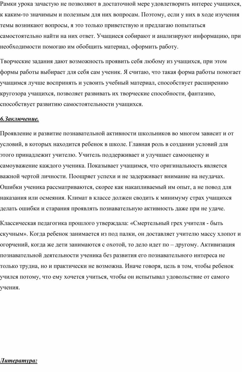 Классическая педагогика прошлого утверждала: «Смертельный грех учителя - быть скучным». Когда ребенок занимается из под палки, он доставляет учителю массу хлопот и огорчений, когда же дети занимаются с охотой, то дело идет по – другому. Активизация познавательной деятельности ученика без развития его познавательного интереса не только трудна, но и практически не возможна. Иначе говоря, цель в том, чтобы ребенок учился потому, что ему хочется учиться, чтобы он испытывал удовольствие от самого учения.