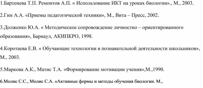 6.Молис С.С., Молис С.А. «Активные формы и методы обучения биологии. М.,
