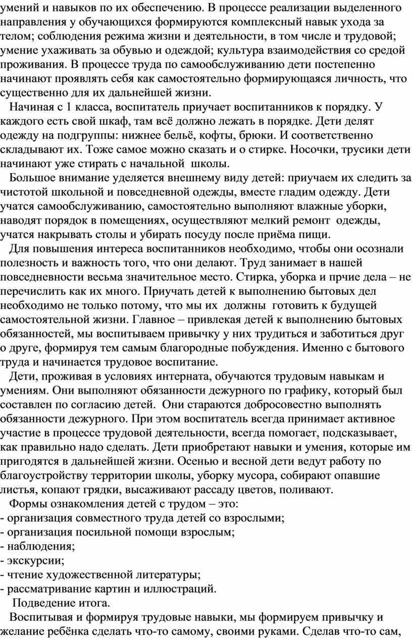 Дети, проживая в условиях интерната, обучаются трудовым навыкам и умениям. Они выполняют обязанности дежурного по графику, который был составлен по согласию детей. Они стараются добросовестно выполнять обязанности дежурного. При этом воспитатель всегда принимает активное участие в процессе трудовой деятельности, всегда помогает, подсказывает, как правильно надо сделать. Дети приобретают навыки и умения, которые им пригодятся в дальнейшей жизни. Осенью и весной дети ведут работу по благоустройству территории школы, уборку мусора, собирают опавшие листья, копают грядки, высаживают рассаду цветов, поливают.