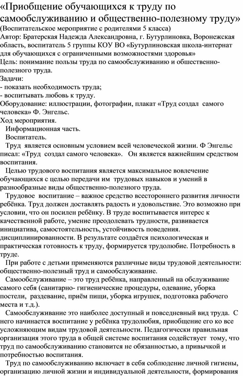 Цель: понимание пользы труда по самообслуживанию и обшественно-полезного труда.