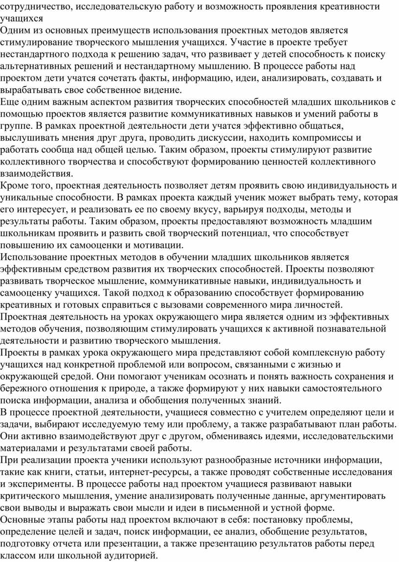 Аннотация. В данной статье будет рассмотрено, как проектная деятельность влияет на развитие творческих способностей учащихся начальных классов, на их активность и интерес к предмету.