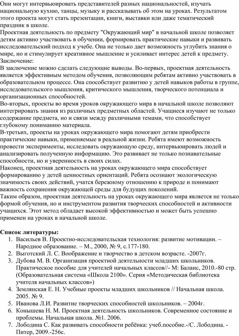 Таким образом, проектная деятельность на уроках окружающего мира является не только формой обучения, но и инструментом развития творческих способностей и активности учащихся. Этот метод обладает высокой эффективностью и может быть успешно применен на уроках в начальной школе.
