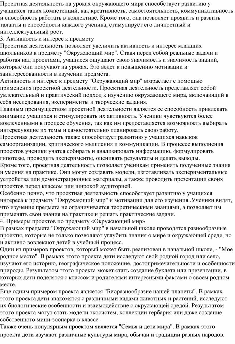 Проектная деятельность на уроках окружающего мира способствует развитию у учащихся таких компетенций, как креативность, самостоятельность, коммуникативность и способность работать в коллективе. Кроме того, она позволяет проявить и развить таланты и способности каждого ученика, стимулирует его личностный и интеллектуальный рост.