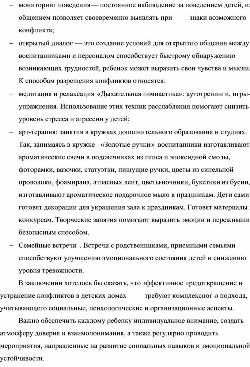 В заключении хотелось бы сказать, что эффективное предотвращение и устранение конфликтов в детских домах требуют комплексного подхода, учитывающего социальные, психологические и организационные аспекты.