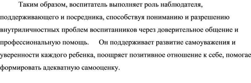 Таким образом, воспитатель выполняет роль наблюдателя, поддерживающего и посредника, способствуя пониманию и разрешению внутриличностных проблем воспитанников через доверительное общение и профессиональную помощь. Он поддерживает развитие самоуважения и уверенности каждого ребенка, поощряет позитивное отношение к себе, помогает формировать адекватную самооценку.