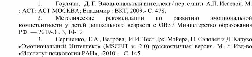 1. Гоулман, Д. Г. Эмоциональный интеллект / пер. с англ. А.П. Исаевой. М. : ACT: АСТ МОСКВА; Владимир : ВКТ, 2009.- С. 478.
