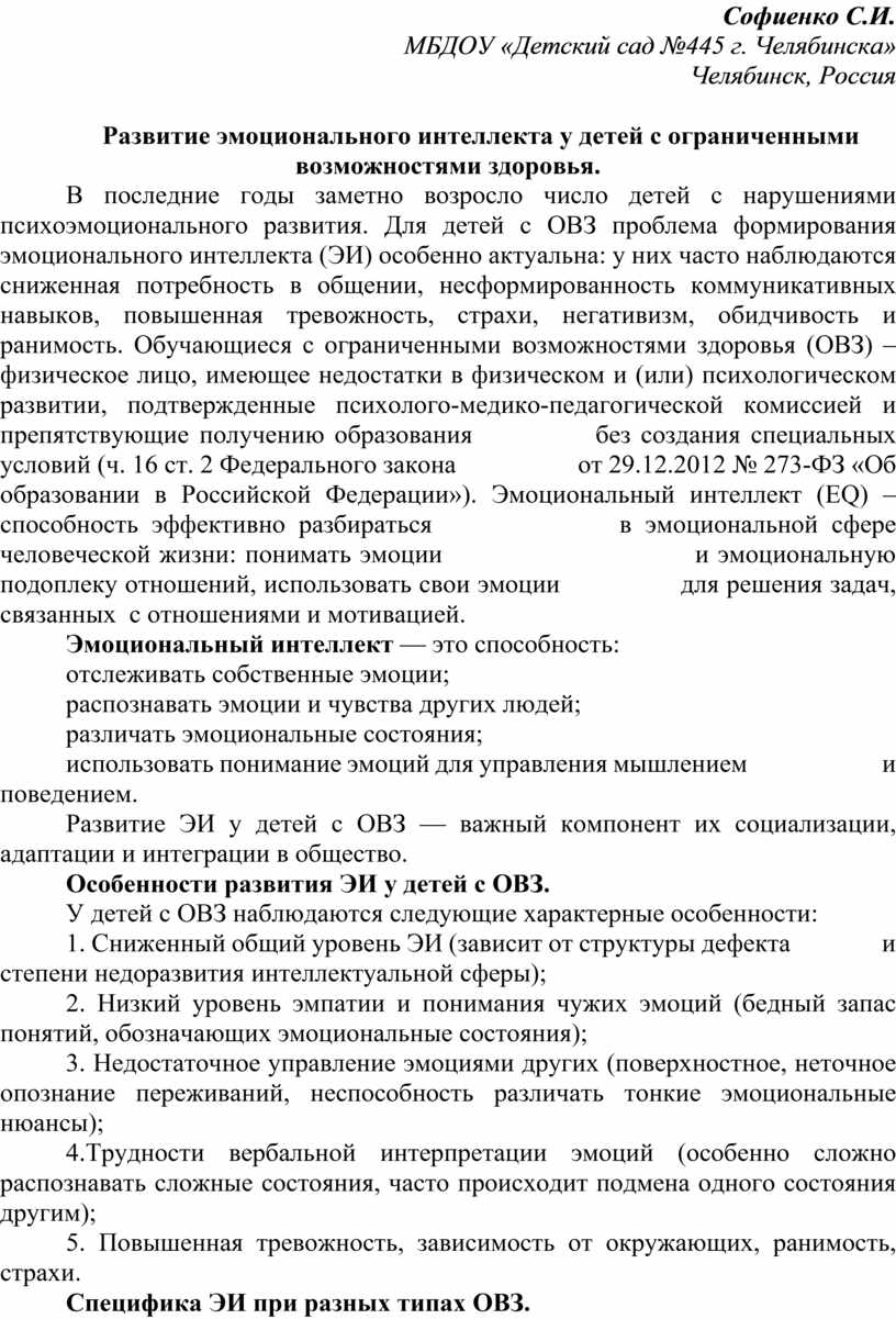 В последние годы заметно возросло число детей с нарушениями психоэмоционального развития. Для детей с ОВЗ проблема формирования эмоционального интеллекта (ЭИ) особенно актуальна: у них часто наблюдаются сниженная потребность в общении, несформированность коммуникативных навыков, повышенная тревожность, страхи, негативизм, обидчивость и ранимость. Обучающиеся с ограниченными возможностями здоровья (ОВЗ) – физическое лицо, имеющее недостатки в физическом и (или) психологическом развитии, подтвержденные психолого-медико-педагогической комиссией и препятствующие получению образования без создания специальных условий (ч. 16 ст. 2 Федерального закона от 29.12.2012 № 273-ФЗ «Об образовании в Российской Федерации»). Эмоциональный интеллект (EQ) – способность эффективно разбираться в эмоциональной сфере человеческой жизни: понимать эмоции и эмоциональную подоплеку отношений, использовать свои эмоции для решения задач, связанных с отношениями и мотивацией.
