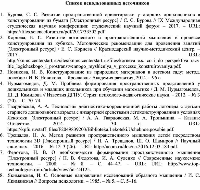 2. Корнева, Е. С. Развитие логического и пространственного мышления в процессе конструирования из кубиков. Методические рекомендации для проведения занятий [Электронный ресурс] / Е. С. Корнева // Краснодарский научно-методический центр. – 2017. – URL: http://knmc.centerstart.ru/sites/knmc.centerstart.ru/files/korneva_e.s._co_i_do_perspektiva_razvitie_logicheskogo_i_prostranstvennogo_myshleniya_v_processe_konstruirovaniya.pdf.