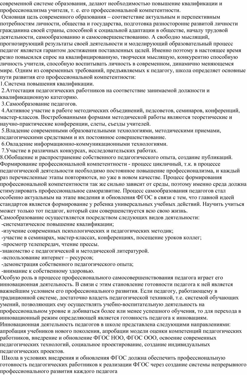 Основная цель современного образования – соответствие актуальным и перспективным потребностям личности, общества и государства, подготовка разносторонне развитой личности гражданина своей страны, способной к социальной адаптации в обществе, началу трудовой деятельности, самообразованию и самосовершенствованию. А свободно мыслящий, прогнозирующий результаты своей деятельности и моделирующий образовательный процесс педагог является гарантом достижения поставленных целей. Именно поэтому в настоящее время резко повысился спрос на квалифицированную, творчески мыслящую, конкурентно способную личность учителя, способную воспитывать личность в современном, динамично меняющемся мире. Одним из современных требований, предъявляемых к педагогу, школа определяет основные пути развития его профессиональной компетентности: