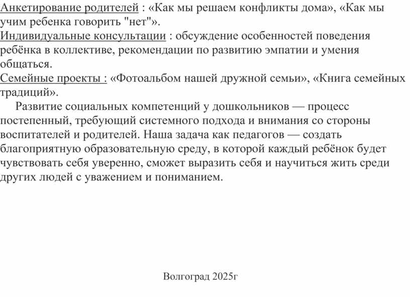 Развитие социальных компетенций у дошкольников — процесс постепенный, требующий системного подхода и внимания со стороны воспитателей и родителей. Наша задача как педагогов — создать благоприятную образовательную среду, в которой каждый ребёнок будет чувствовать себя уверенно, сможет выразить себя и научиться жить среди других людей с уважением и пониманием.