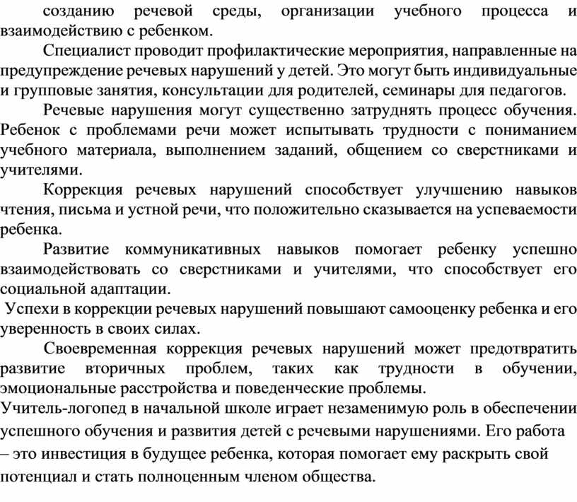 Учитель-логопед в начальной школе играет незаменимую роль в обеспечении успешного обучения и развития детей с речевыми нарушениями. Его работа – это инвестиция в будущее ребенка, которая помогает ему раскрыть свой потенциал и стать полноценным членом общества.