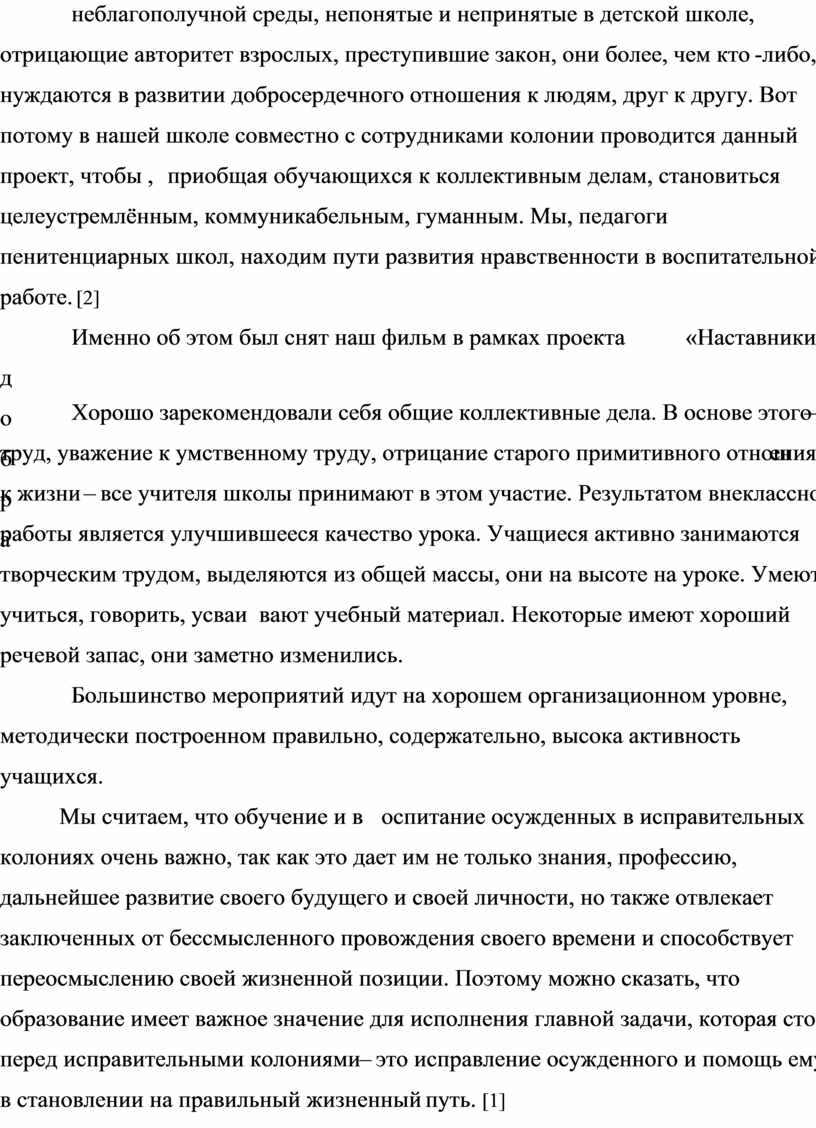 Дети, видящие добро с детства, будут стремиться делать его на протяжении всей жизни, а если эти дети были брошены на произвол судьбы, то о каком человеколюбии и доброте вести речь?! Учащиеся школы пенитенциарной системы – это учащиеся, имеющие негативный асоциальный жизненный опыт, нарушившие нормы человеческой морали, выросшие в атмосфере отрицательных жизненных примеров, лишённые домашнего воспитания и живущие в атмосфере неблагополучной среды, непонятые и непринятые в детской школе, отрицающие авторитет взрослых, преступившие закон, они более, чем кто-либо, нуждаются в развитии добросердечного отношения к людям, друг к другу. Вот потому в нашей школе совместно с сотрудниками колонии проводится данный проект, чтобы, приобщая обучающихся к коллективным делам, становиться целеустремлённым, коммуникабельным, гуманным. Мы, педагоги пенитенциарных школ, находим пути развития нравственности в воспитательной работе. [2]