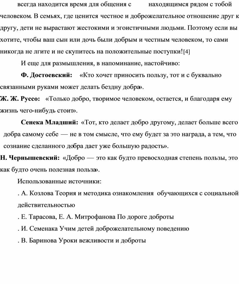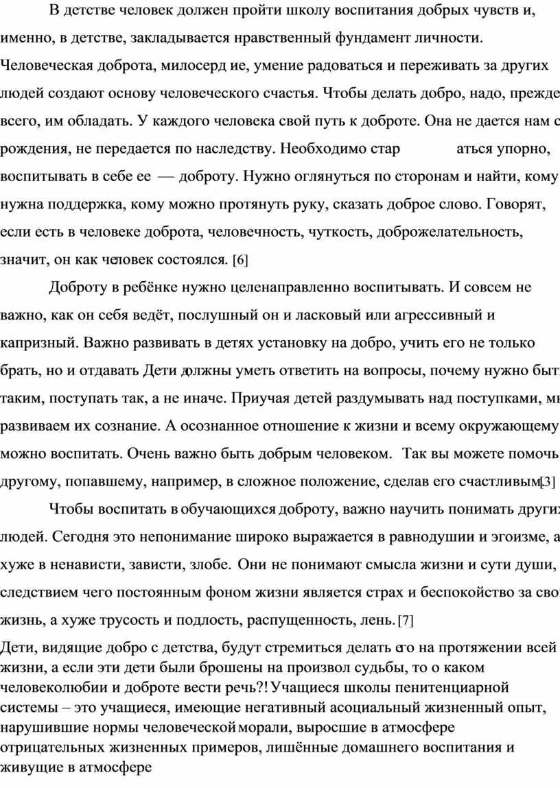 В детстве человек должен пройти школу воспитания добрых чувств и, именно, в детстве, закладывается нравственный фундамент личности. Человеческая доброта, милосердие, умение радоваться и переживать за других людей создают основу человеческого счастья. Чтобы делать добро, надо, прежде всего, им обладать. У каждого человека свой путь к доброте. Она не дается нам с рождения, не передается по наследству. Необходимо стараться упорно, воспитывать в себе ее — доброту. Нужно оглянуться по сторонам и найти, кому нужна поддержка, кому можно протянуть руку, сказать доброе слово. Говорят, если есть в человеке доброта, человечность, чуткость, доброжелательность, значит, он как человек состоялся. [6]