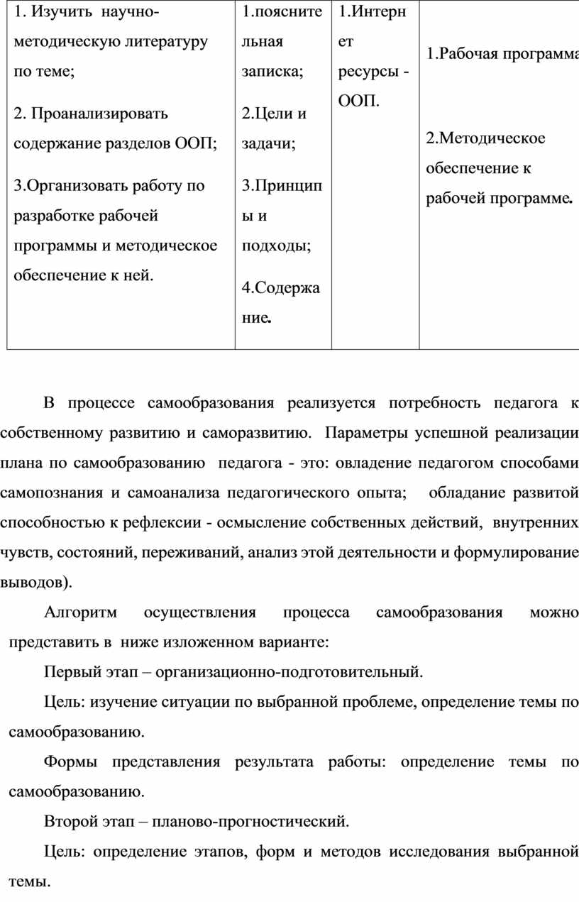 1. Изучить научно-методическую литературу по теме; 2. Проанализировать содержание разделов ООП; 3.Организовать работу по разработке рабочей программы и методическое обеспечение к ней. |
