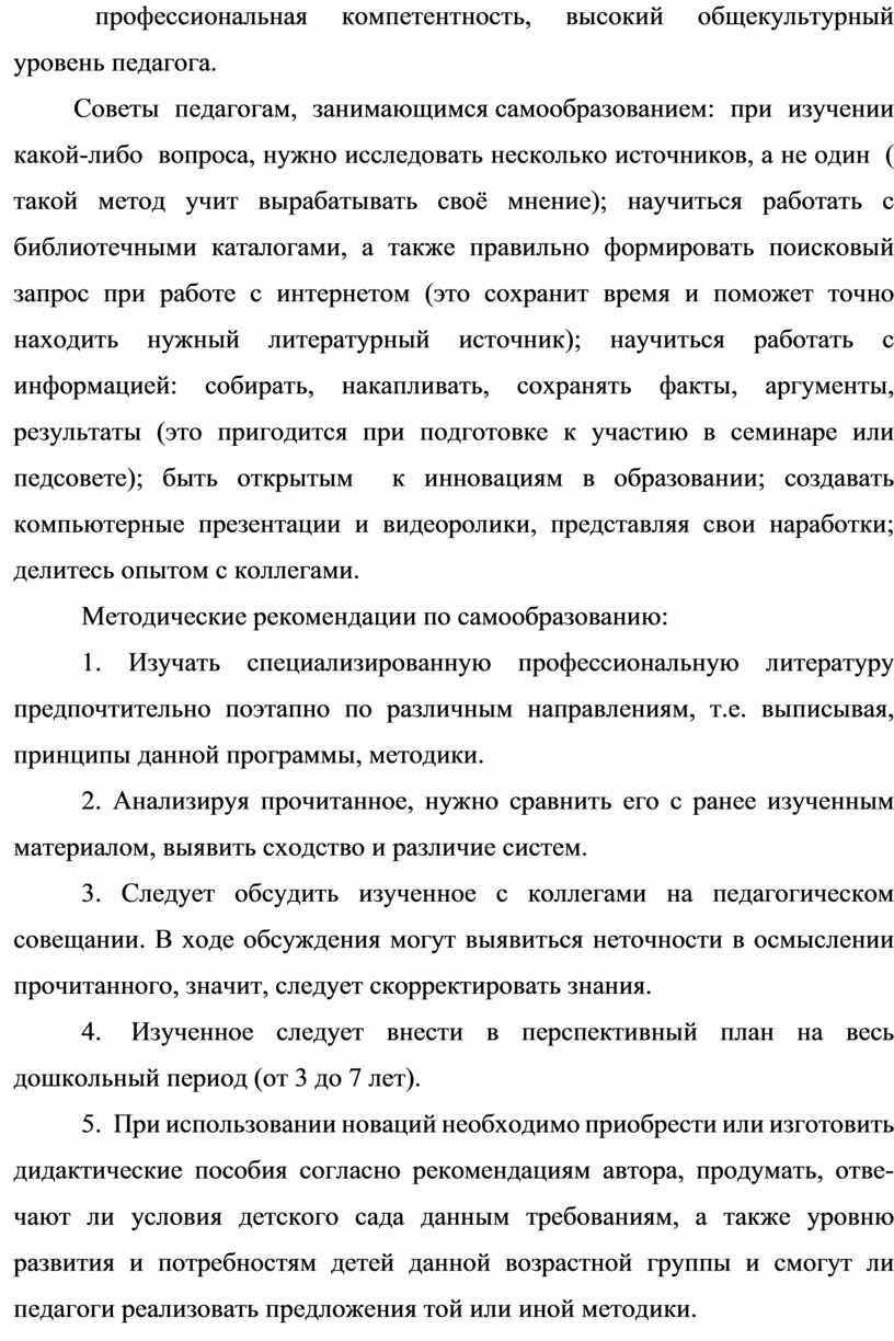 В процессе самообразования, согласно современным требованиям, мы выполняем следующие виды работ: изучаем методическую и педагогическую литературу, информацию в Интернете по интересующему вопросу, педагогические и информационно-компьютерные технологии; просматриваем определенные телепередачи; внедряем новые педагогические технологии, формы, методы и приемы обучения в ходе проведение открытых просмотров НОД для анализа со стороны коллег; организуем формы дополнительного образования по изучаемому вопросу; посещаем дискуссии, совещания, семинары, тренинги, конференции, НОД коллег и участвуем в обмене опытом; периодически проводим самоанализ своей профессиональной деятельности; систематически проходим курсы повышения квалификации; совершенствуем свои знания в области классической и современной психологии и педагогики; систематически интересуемся событиями современной экономической, политической и культурной жизни; повышаем уровень своей эрудиции, правовой и общей культуры.