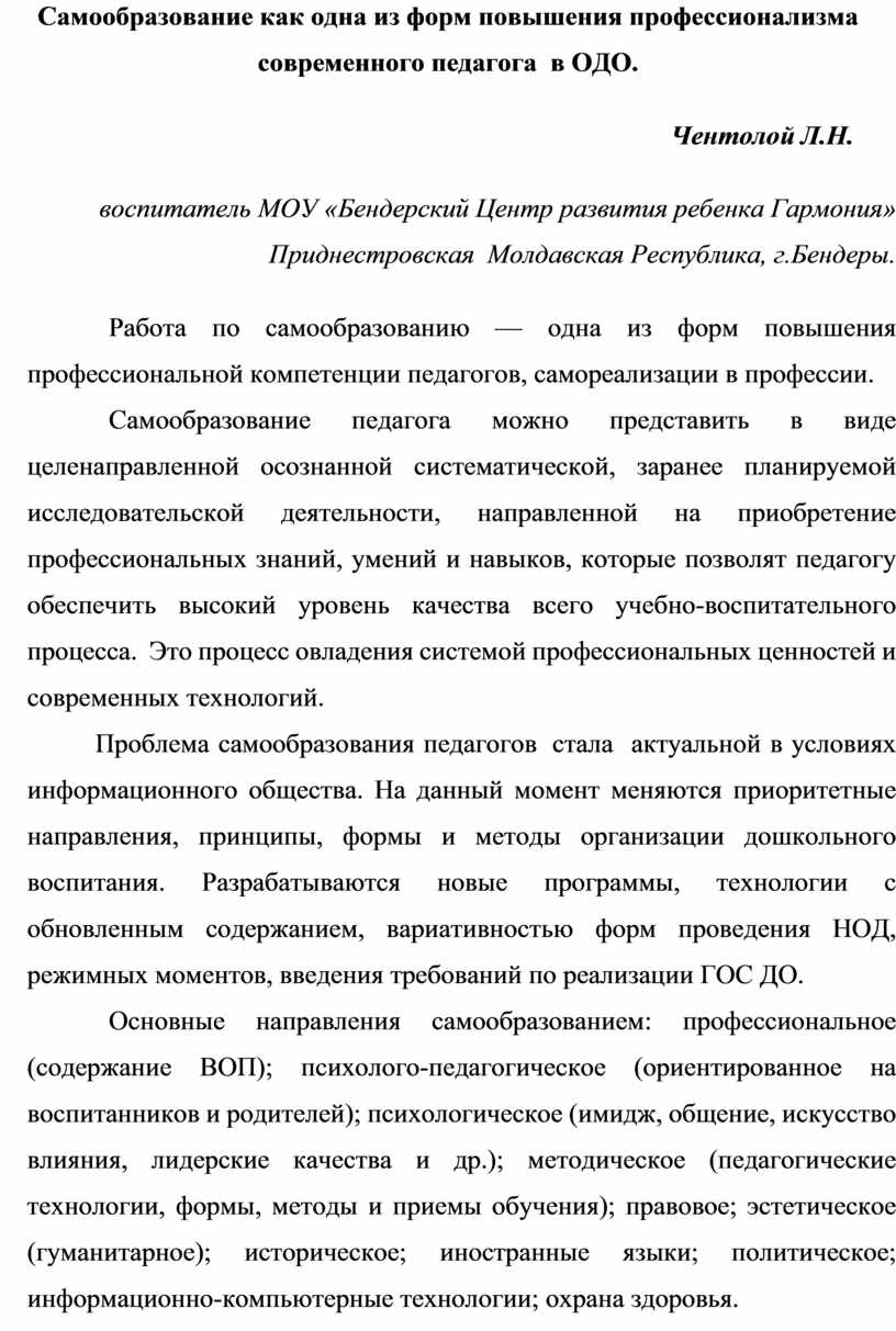 Самообразование как одна из форм повышения профессионализма современного педагога в ОДО.