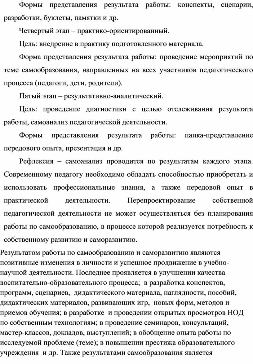 В процессе самообразования реализуется потребность педагога к собственному развитию и саморазвитию. Параметры успешной реализации плана по самообразованию педагога - это: овладение педагогом способами самопознания и самоанализа педагогического опыта; обладание развитой способностью к рефлексии - осмысление собственных действий, внутренних чувств, состояний, переживаний, анализ этой деятельности и формулирование выводов).