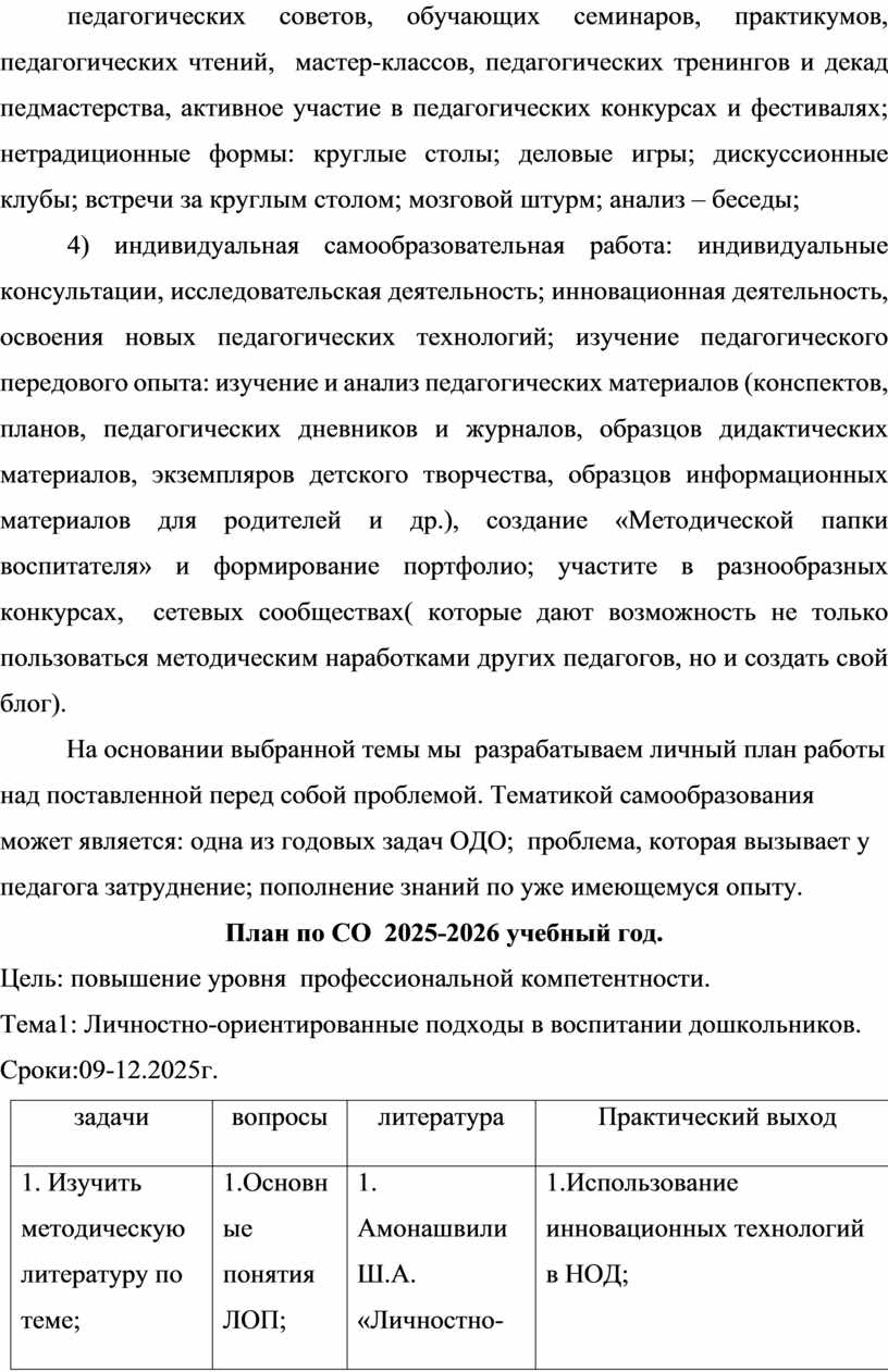 На основании выбранной темы мы разрабатываем личный план работы над поставленной перед собой проблемой. Тематикой самообразования может является: одна из годовых задач ОДО; проблема, которая вызывает у педагога затруднение; пополнение знаний по уже имеющемуся опыту.