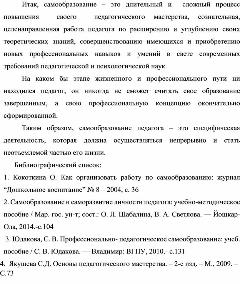 1. Кокоткина О. Как организовать работу по самообразованию: журнал “Дошкольное воспитание” № 8 – 2004, с. 36