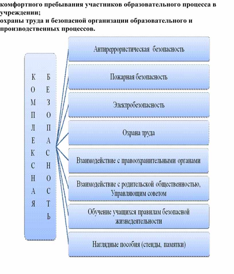 Система комплексной безопасности подразумевает состояние защищенности образовательного учреждения от реальных и прогнозируемых угроз социального, техногенного и природного характера, обеспечивающее его безопасное функционирование. Поэтому нет важнее задачи для образовательного учреждения, чем обеспечение безопасных условий проведения учебно-воспитательного процесса, которые предполагают гарантии сохранения жизни и здоровья учащихся.