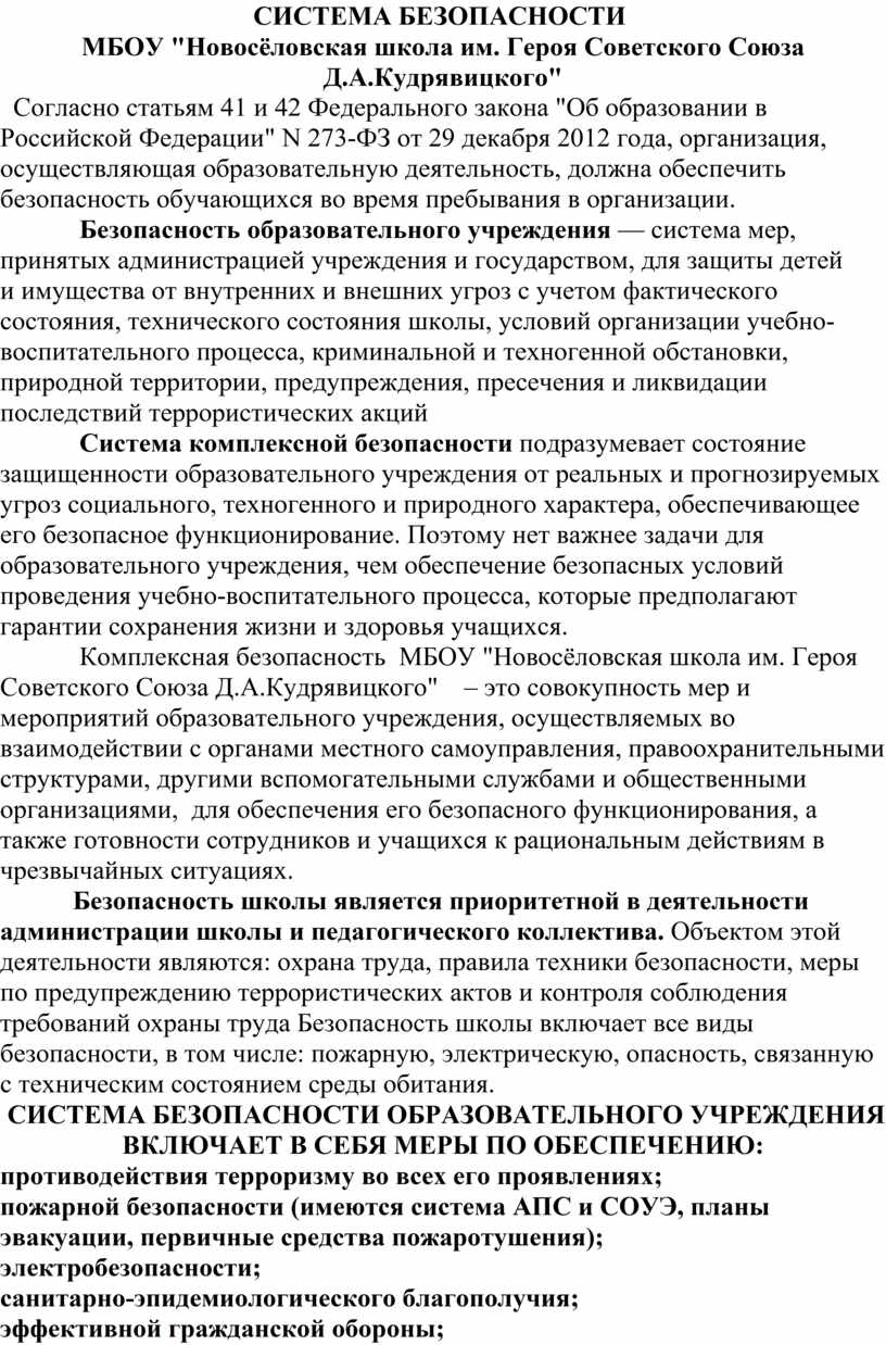 Комплексная безопасность МБОУ "Новосёловская школа им. Героя Советского Союза Д.А.Кудрявицкого" – это совокупность мер и мероприятий образовательного учреждения, осуществляемых во взаимодействии с органами местного самоуправления, правоохранительными структурами, другими вспомогательными службами и общественными организациями, для обеспечения его безопасного функционирования, а также готовности сотрудников и учащихся к рациональным действиям в чрезвычайных ситуациях.