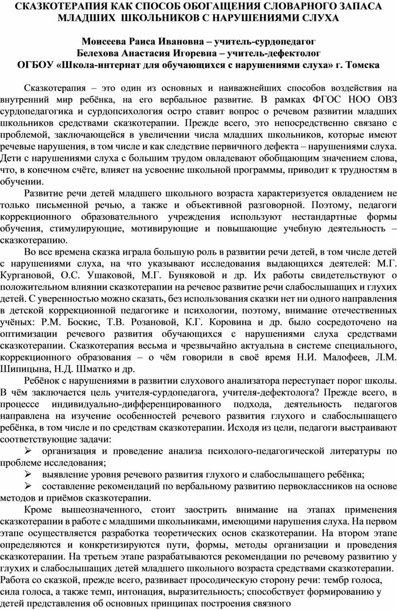 СКАЗКОТЕРАПИЯ КАК СПОСОБ ОБОГАЩЕНИЯ СЛОВАРНОГО ЗАПАСА МЛАДШИХ ШКОЛЬНИКОВ С НАРУШЕНИЯМИ СЛУХА