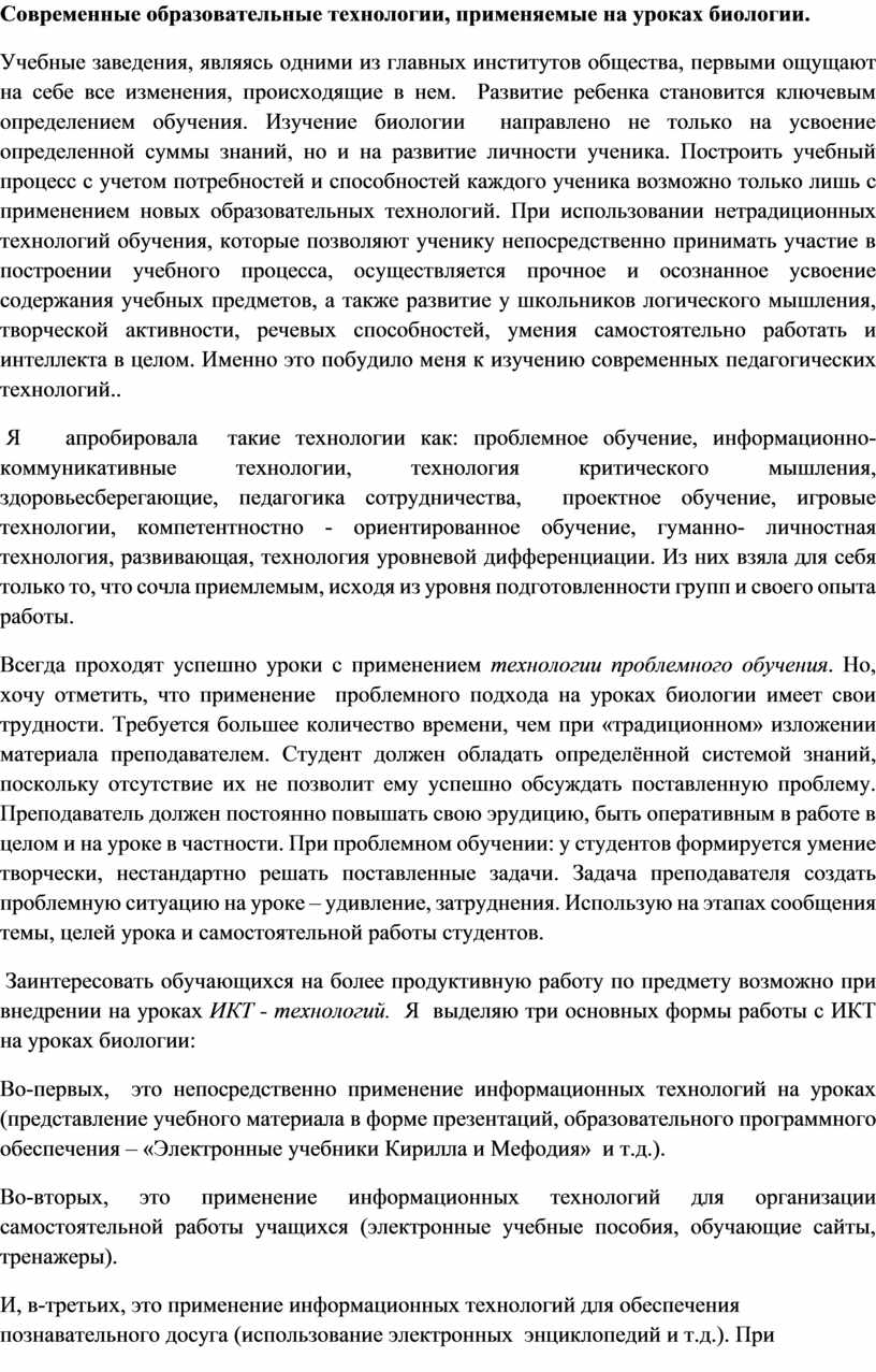 Учебные заведения, являясь одними из главных институтов общества, первыми ощущают на себе все изменения, происходящие в нем. Развитие ребенка становится ключевым определением обучения. Изучение биологии направлено не только на усвоение определенной суммы знаний, но и на развитие личности ученика. Построить учебный процесс с учетом потребностей и способностей каждого ученика возможно только лишь с применением новых образовательных технологий. При использовании нетрадиционных технологий обучения, которые позволяют ученику непосредственно принимать участие в построении учебного процесса, осуществляется прочное и осознанное усвоение содержания учебных предметов, а также развитие у школьников логического мышления, творческой активности, речевых способностей, умения самостоятельно работать и интеллекта в целом. Именно это побудило меня к изучению современных педагогических технологий..