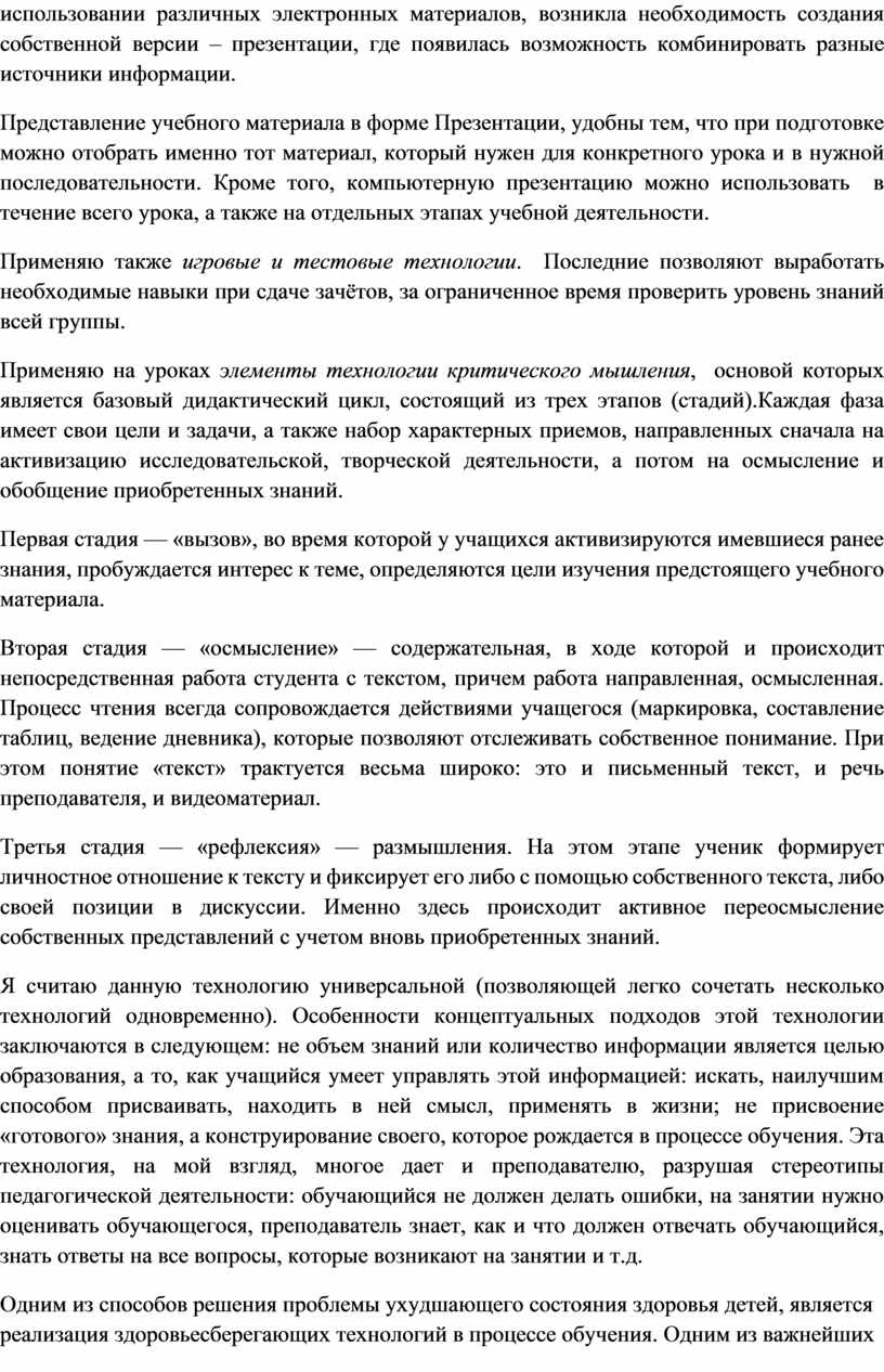 Я апробировала такие технологии как: проблемное обучение, информационно-коммуникативные технологии, технология критического мышления, здоровьесберегающие, педагогика сотрудничества, проектное обучение, игровые технологии, компетентностно - ориентированное обучение, гуманно- личностная технология, развивающая, технология уровневой дифференциации. Из них взяла для себя только то, что сочла приемлемым, исходя из уровня подготовленности групп и своего опыта работы.