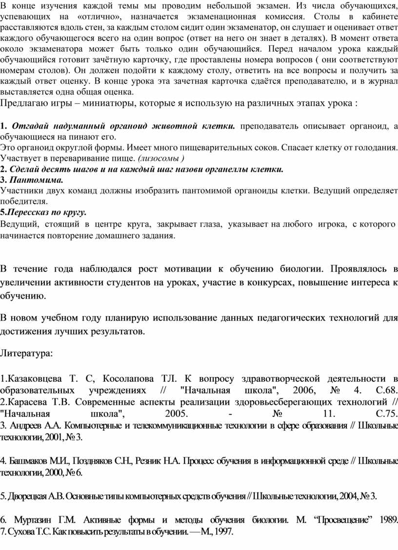 Г.М. Активные формы и методы обучения биологии. М. “Просвещение” 1989.