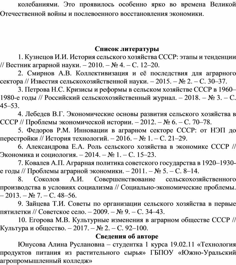 1. Кузнецов И.И. История сельского хозяйства СССР: этапы и тенденции // Вестник аграрной науки. – 2010. – № 4. – С. 12–20.