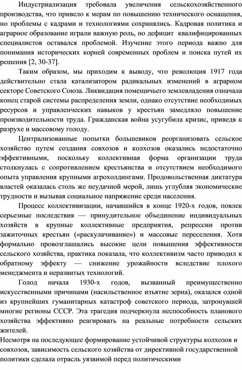 2. Смирнов А.В. Коллективизация и её последствия для аграрного сектора // Известия сельскохозяйственной науки. – 2015. – № 2. – С. 30–37.