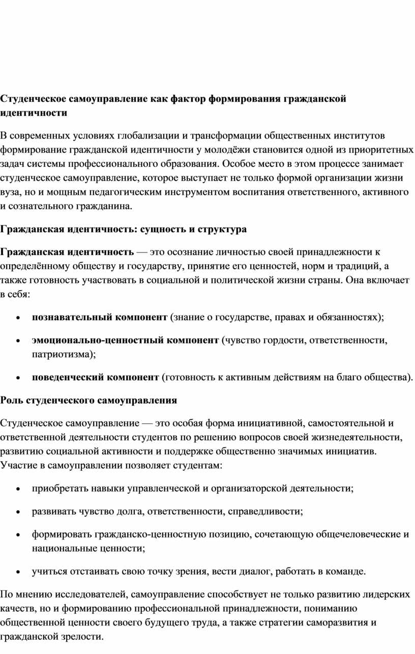 В современных условиях глобализации и трансформации общественных институтов формирование гражданской идентичности у молодёжи становится одной из приоритетных задач системы профессионального образования. Особое место в этом процессе занимает студенческое самоуправление, которое выступает не только формой организации жизни вуза, но и мощным педагогическим инструментом воспитания ответственного, активного и сознательного гражданина.