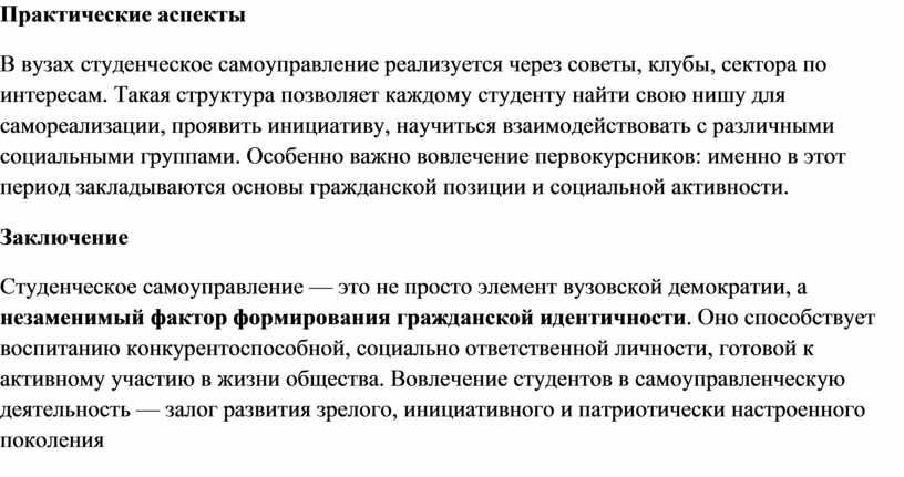 Студенческое самоуправление — это не просто элемент вузовской демократии, а незаменимый фактор формирования гражданской идентичности. Оно способствует воспитанию конкурентоспособной, социально ответственной личности, готовой к активному участию в жизни общества. Вовлечение студентов в самоуправленческую деятельность — залог развития зрелого, инициативного и патриотически настроенного поколения