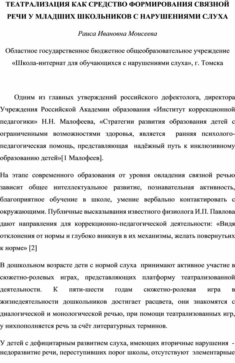 ТЕАТРАЛИЗАЦИЯ КАК СРЕДСТВО ФОРМИРОВАНИЯ СВЯЗНОЙ РЕЧИ У МЛАДШИХ ШКОЛЬНИКОВ С НАРУШЕНИЯМИ СЛУХА