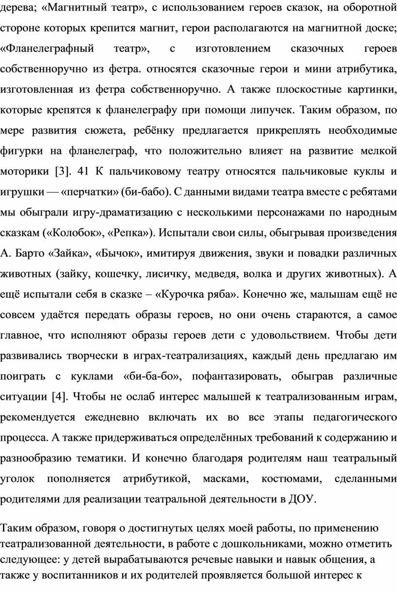 В процессе обыгрывания коротких русских народных сказок, используются такие виды театрализованных игр как «Настольный и настольно-плоскостной театр», с изготовлением сказочных персонажей изготовленных из бумаги и дерева; «Магнитный театр», с использованием героев сказок, на оборотной стороне которых крепится магнит, герои располагаются на магнитной доске; «Фланелеграфный театр», с изготовлением сказочных героев собственноручно из фетра. относятся сказочные герои и мини атрибутика, изготовленная из фетра собственноручно. А также плоскостные картинки, которые крепятся к фланелеграфу при помощи липучек. Таким образом, по мере развития сюжета, ребёнку предлагается прикреплять необходимые фигурки на фланелеграф, что положительно влияет на развитие мелкой моторики [3]. 41 К пальчиковому театру относятся пальчиковые куклы и игрушки — «перчатки» (би-бабо). С данными видами театра вместе с ребятами мы обыграли игру-драматизацию с несколькими персонажами по народным сказкам («Колобок», «Репка»). Испытали свои силы, обыгрывая произведения А. Барто «Зайка», «Бычок», имитируя движения, звуки и повадки различных животных (зайку, кошечку, лисичку, медведя, волка и других животных). А ещё испытали себя в сказке – «Курочка ряба». Конечно же, малышам ещё не совсем удаётся передать образы героев, но они очень стараются, а самое главное, что исполняют образы героев дети с удовольствием. Чтобы дети развивались творчески в играх-театрализациях, каждый день предлагаю им поиграть с куклами «би-ба-бо», пофантазировать, обыграв различные ситуации [4]. Чтобы не ослаб интерес малышей к театрализованным играм, рекомендуется ежедневно включать их во все этапы педагогического процесса. А также придерживаться определённых требований к содержанию и разнообразию тематики. И конечно благодаря родителям наш театральный уголок пополняется атрибутикой, масками, костюмами, сделанными родителями для реализации театральной деятельности в ДОУ.