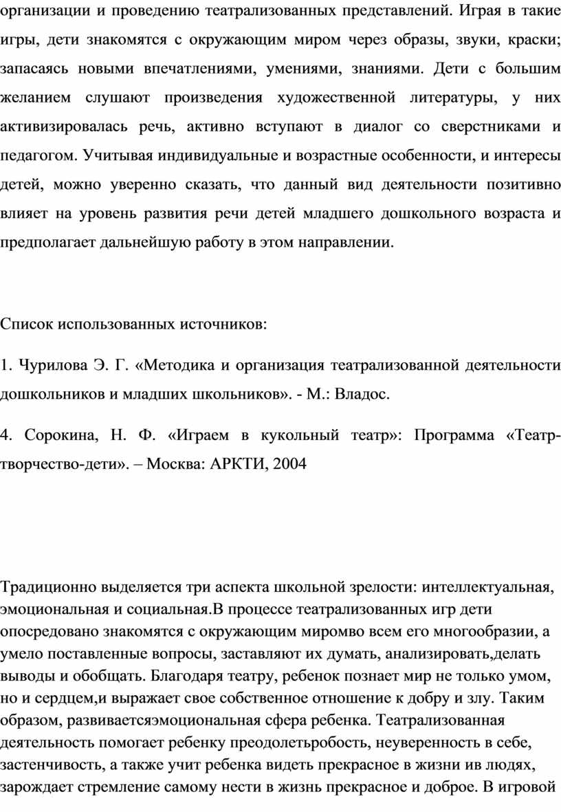 1. Чурилова Э. Г. «Методика и организация театрализованной деятельности дошкольников и младших школьников». - М.: Владос.