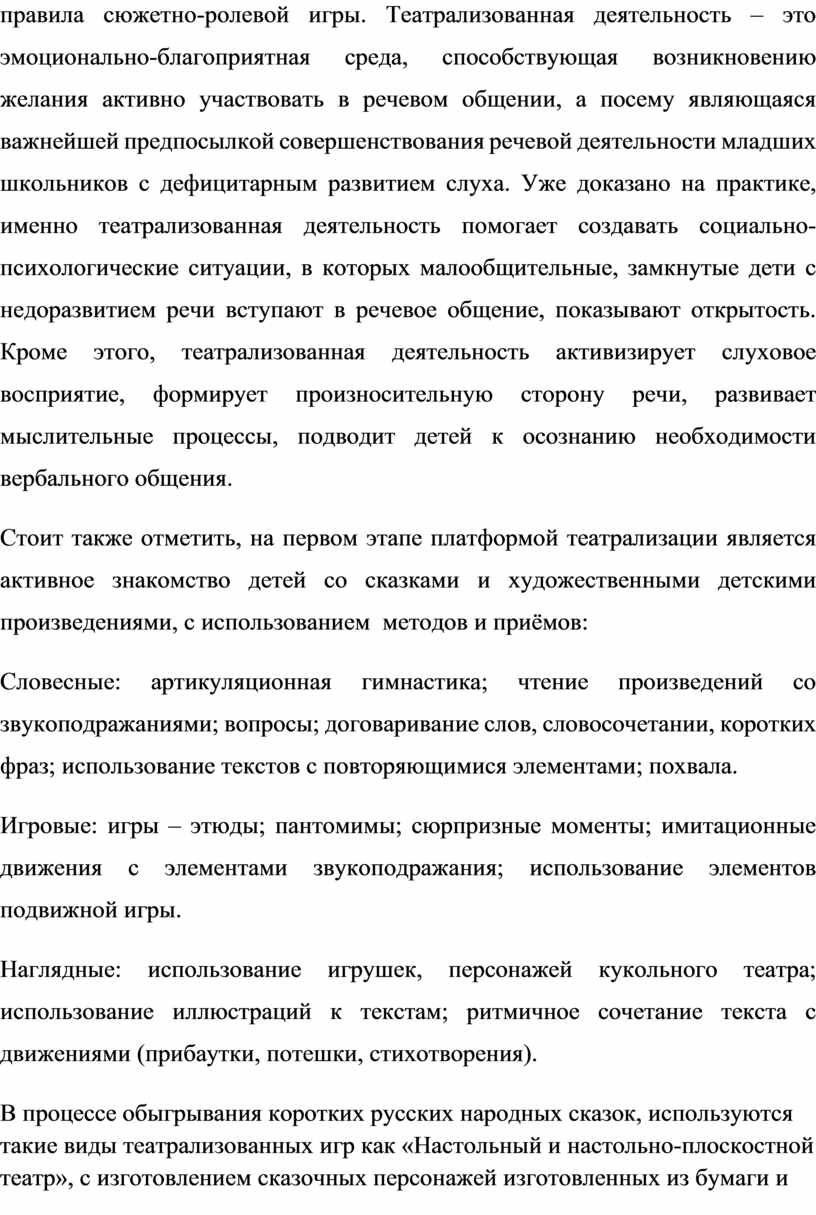 У детей с дефицитарным развитием слуха, имеющих вторичные нарушения - недоразвитие речи, переступивших порог школы, отсутствуют элементарные правила сюжетно-ролевой игры. Театрализованная деятельность – это эмоционально-благоприятная среда, способствующая возникновению желания активно участвовать в речевом общении, а посему являющаяся важнейшей предпосылкой совершенствования речевой деятельности младших школьников с дефицитарным развитием слуха. Уже доказано на практике, именно театрализованная деятельность помогает создавать социально-психологические ситуации, в которых малообщительные, замкнутые дети с недоразвитием речи вступают в речевое общение, показывают открытость. Кроме этого, театрализованная деятельность активизирует слуховое восприятие, формирует произносительную сторону речи, развивает мыслительные процессы, подводит детей к осознанию необходимости вербального общения.
