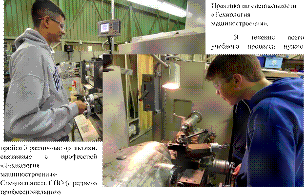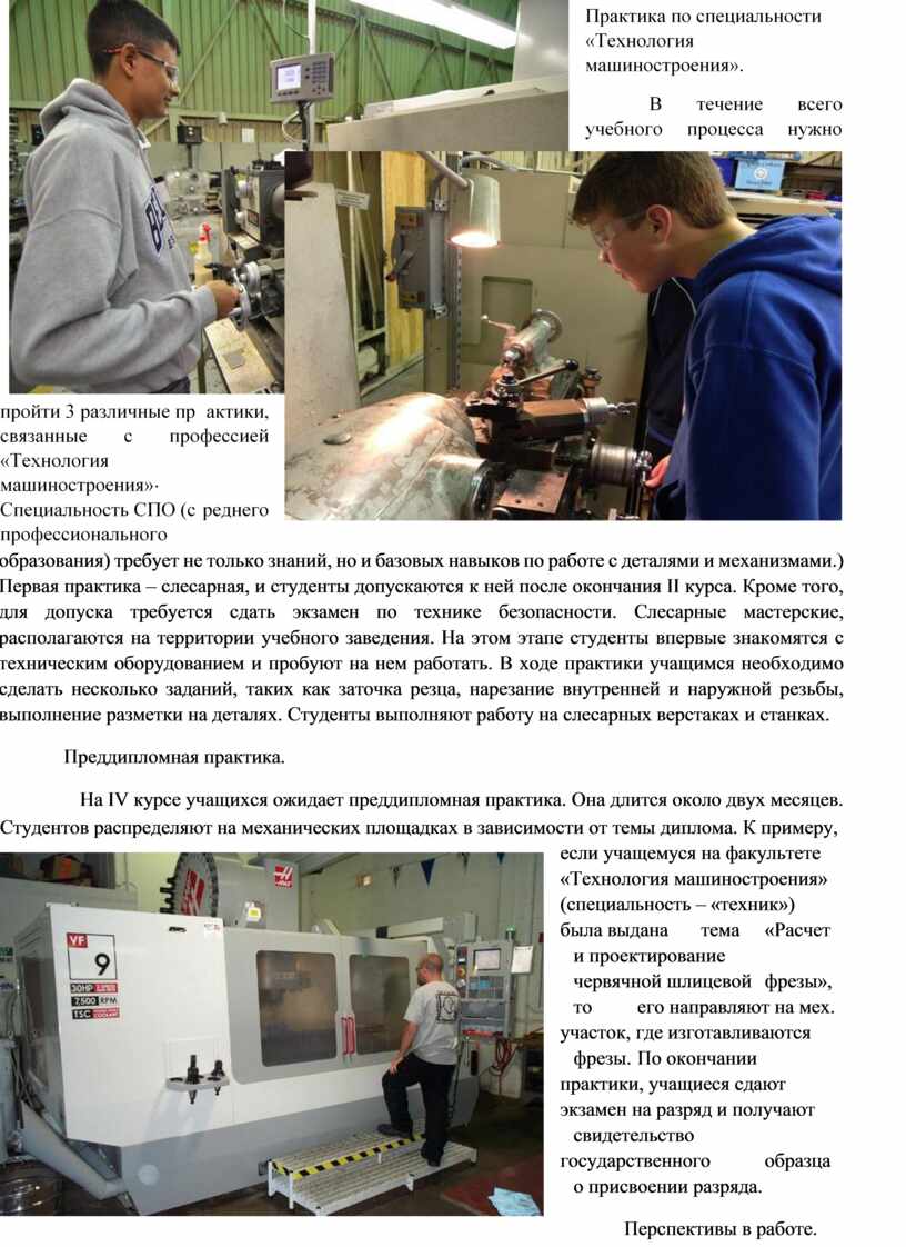 образования) требует не только знаний, но и базовых навыков по работе с деталями и механизмами.) Первая практика – слесарная, и студенты допускаются к ней после окончания II курса. Кроме того, для допуска требуется сдать экзамен по технике безопасности. Слесарные мастерские, располагаются на территории учебного заведения. На этом этапе студенты впервые знакомятся с техническим оборудованием и пробуют на нем работать. В ходе практики учащимся необходимо сделать несколько заданий, таких как заточка резца, нарезание внутренней и наружной резьбы, выполнение разметки на деталях. Студенты выполняют работу на слесарных верстаках и станках.
