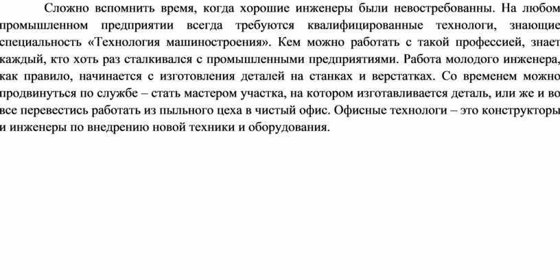 Сложно вспомнить время, когда хорошие инженеры были невостребованны. На любом промышленном предприятии всегда требуются квалифицированные технологи, знающие специальность «Технология машиностроения». Кем можно работать с такой профессией, знает каждый, кто хоть раз сталкивался с промышленными предприятиями. Работа молодого инженера, как правило, начинается с изготовления деталей на станках и верстатках. Со временем можно продвинуться по службе – стать мастером участка, на котором изготавливается деталь, или же и во все перевестись работать из пыльного цеха в чистый офис. Офисные технологи – это конструкторы и инженеры по внедрению новой техники и оборудования.