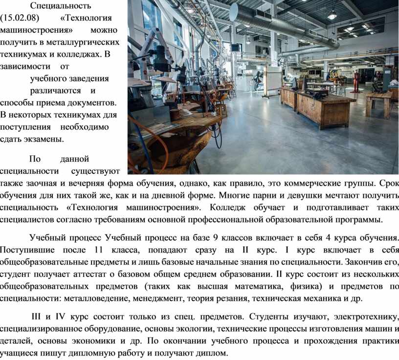 По данной специальности существуют также заочная и вечерняя форма обучения, однако, как правило, это коммерческие группы. Срок обучения для них такой же, как и на дневной форме. Многие парни и девушки мечтают получить специальность «Технология машиностроения». Колледж обучает и подготавливает таких специалистов согласно требованиям основной профессиональной образовательной программы.