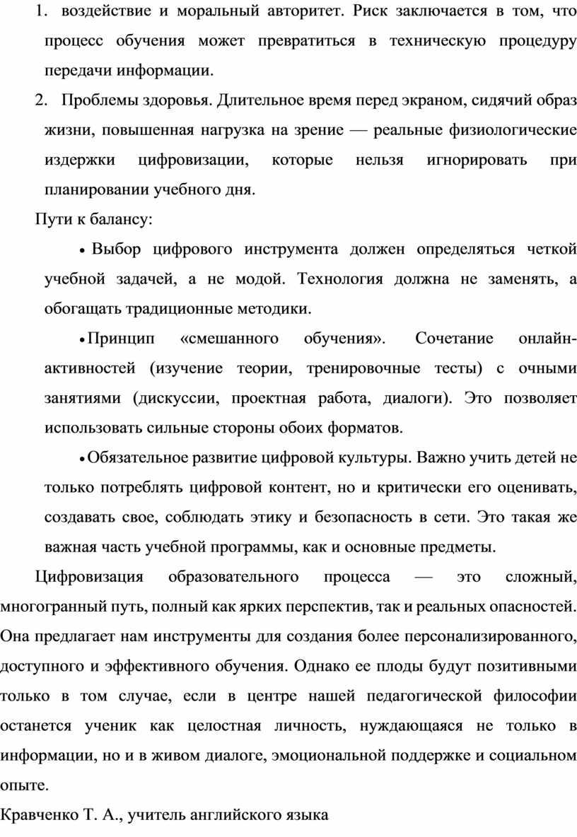 Цифровизация образовательного процесса — это сложный, многогранный путь, полный как ярких перспектив, так и реальных опасностей. Она предлагает нам инструменты для создания более персонализированного, доступного и эффективного обучения. Однако ее плоды будут позитивными только в том случае, если в центре нашей педагогической философии останется ученик как целостная личность, нуждающаяся не только в информации, но и в живом диалоге, эмоциональной поддержке и социальном опыте.