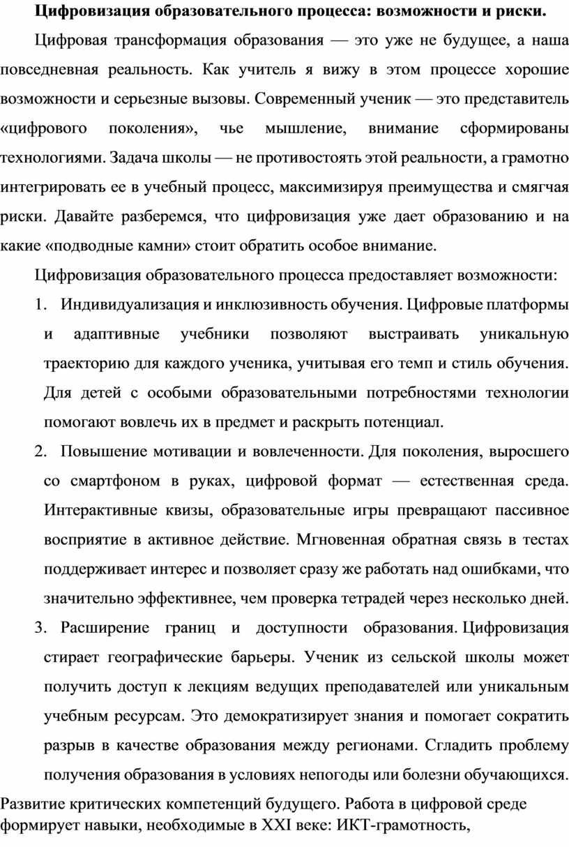 4. Развитие критических компетенций будущего. Работа в цифровой среде формирует навыки, необходимые в XXI веке: ИКТ-грамотность, умение фильтровать информацию, критическое мышление, способность к командной работе в виртуальном пространстве и самоорганизации.