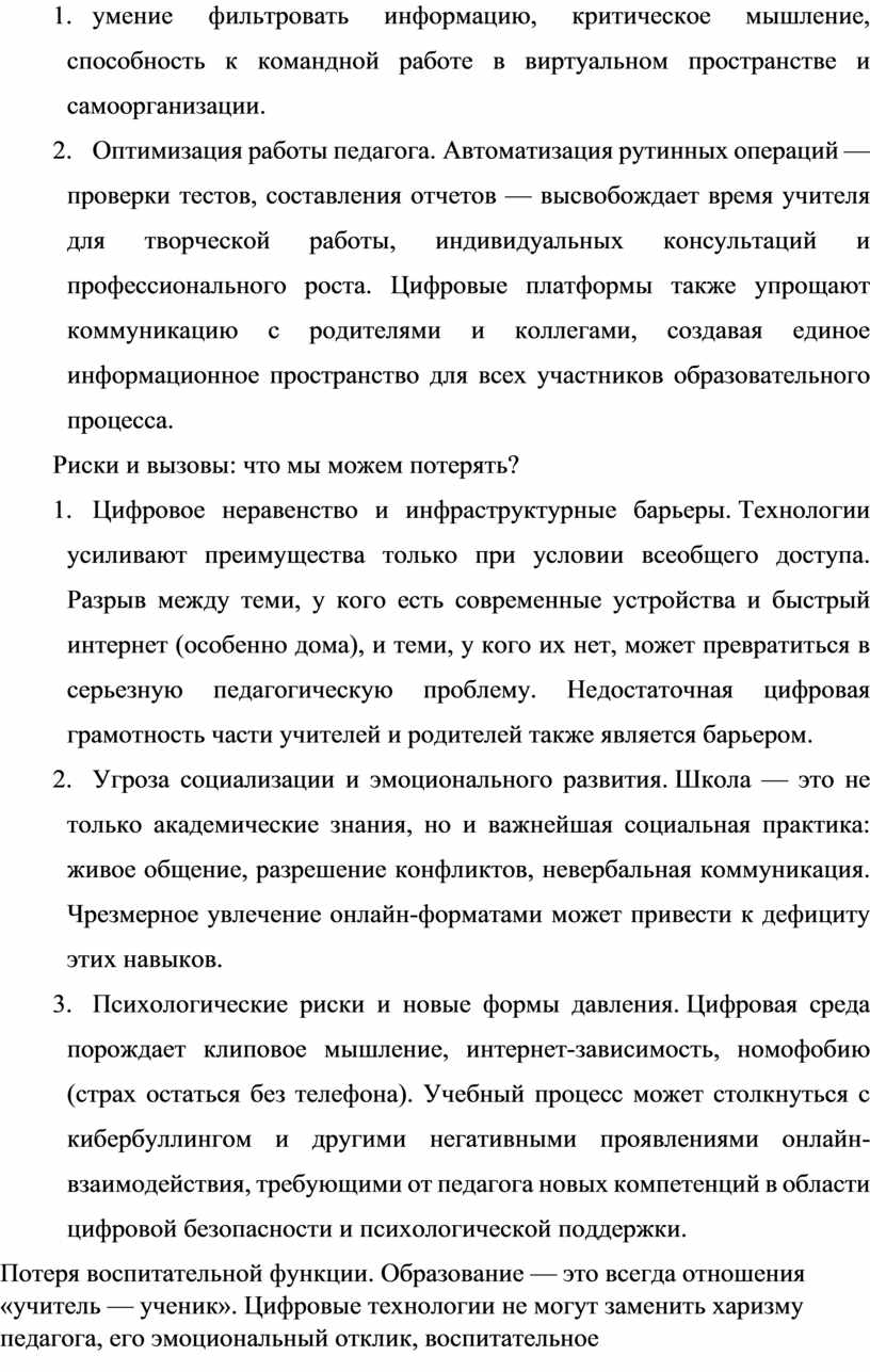 3. Психологические риски и новые формы давления. Цифровая среда порождает клиповое мышление, интернет-зависимость, номофобию (страх остаться без телефона). Учебный процесс может столкнуться с кибербуллингом и другими негативными проявлениями онлайн-взаимодействия, требующими от педагога новых компетенций в области цифровой безопасности и психологической поддержки.