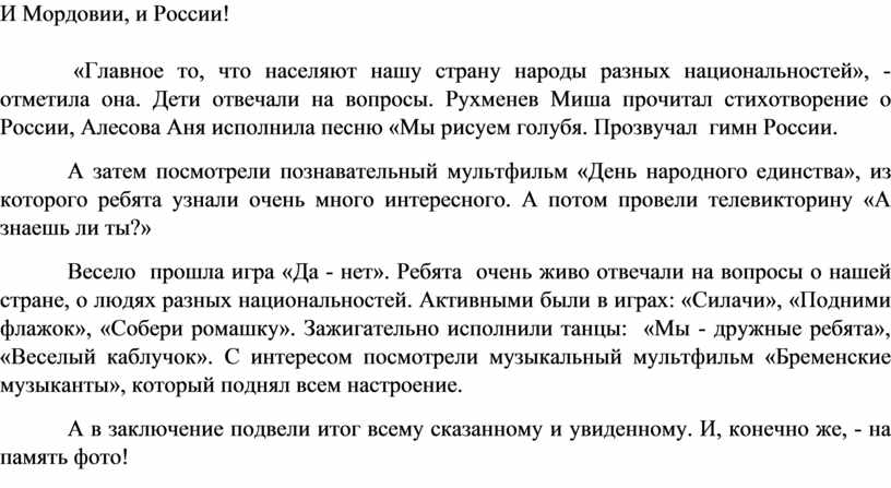 Весело прошла игра «Да - нет». Ребята очень живо отвечали на вопросы о нашей стране, о людях разных национальностей. Активными были в играх: «Силачи», «Подними флажок», «Собери ромашку». Зажигательно исполнили танцы: «Мы - дружные ребята», «Веселый каблучок». С интересом посмотрели музыкальный мультфильм «Бременские музыканты», который поднял всем настроение.