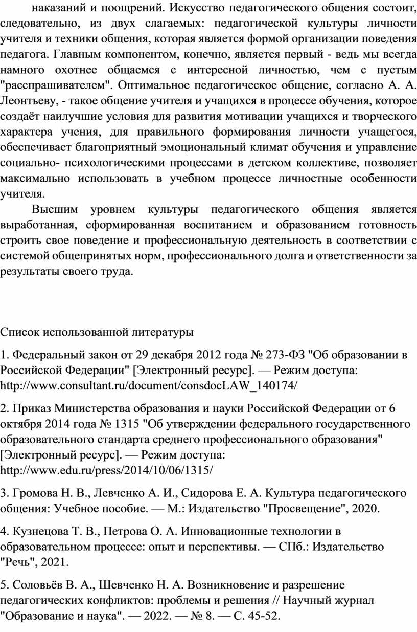 3. Громова Н. В., Левченко А. И., Сидорова Е. А. Культура педагогического общения: Учебное пособие. — М.: Издательство "Просвещение", 2020.